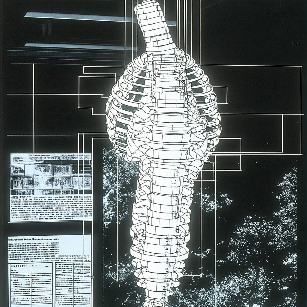 - A kinetic installation made from translucent robotic vertebrae, suspended in midair by magnetic fields, moving subtly to ambient data sonification, glowing fluid flows through its hollow spine, surrounded by holographic projections of speculative anatomy and fictional medical diagrams, gallery is silent except for low-frequency machine hum --sref 537321771 --v 6.1 --stylize 200