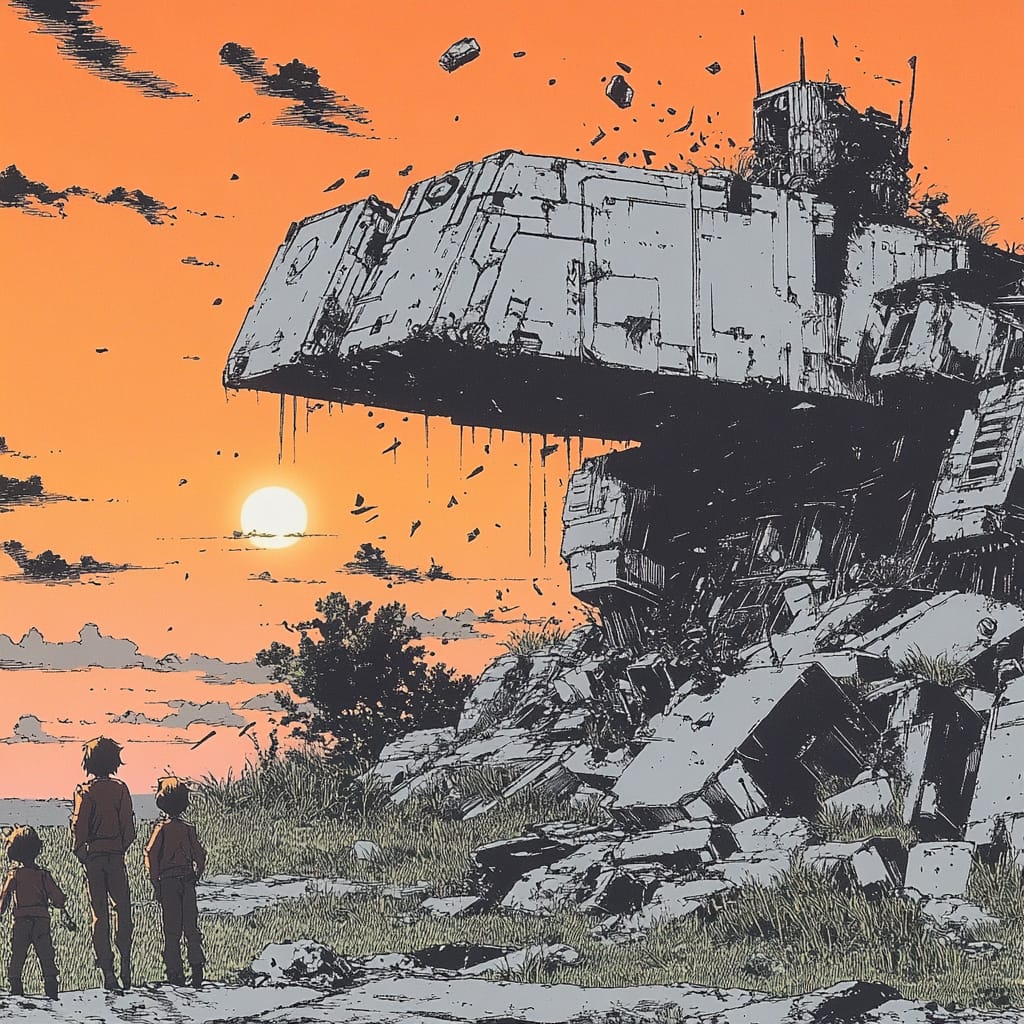 - A manga panel showing a crumbling mecha graveyard at dusk, giant rusting robotic limbs scattered across a field of synthetic grass, children climbing on broken helmets and cockpit glass, sky filled with decaying orbital debris falling like slow rain, illustrated in dense linework with muted sunset tones and high visual noise --sref 537321771 --v 6.1 --stylize 200