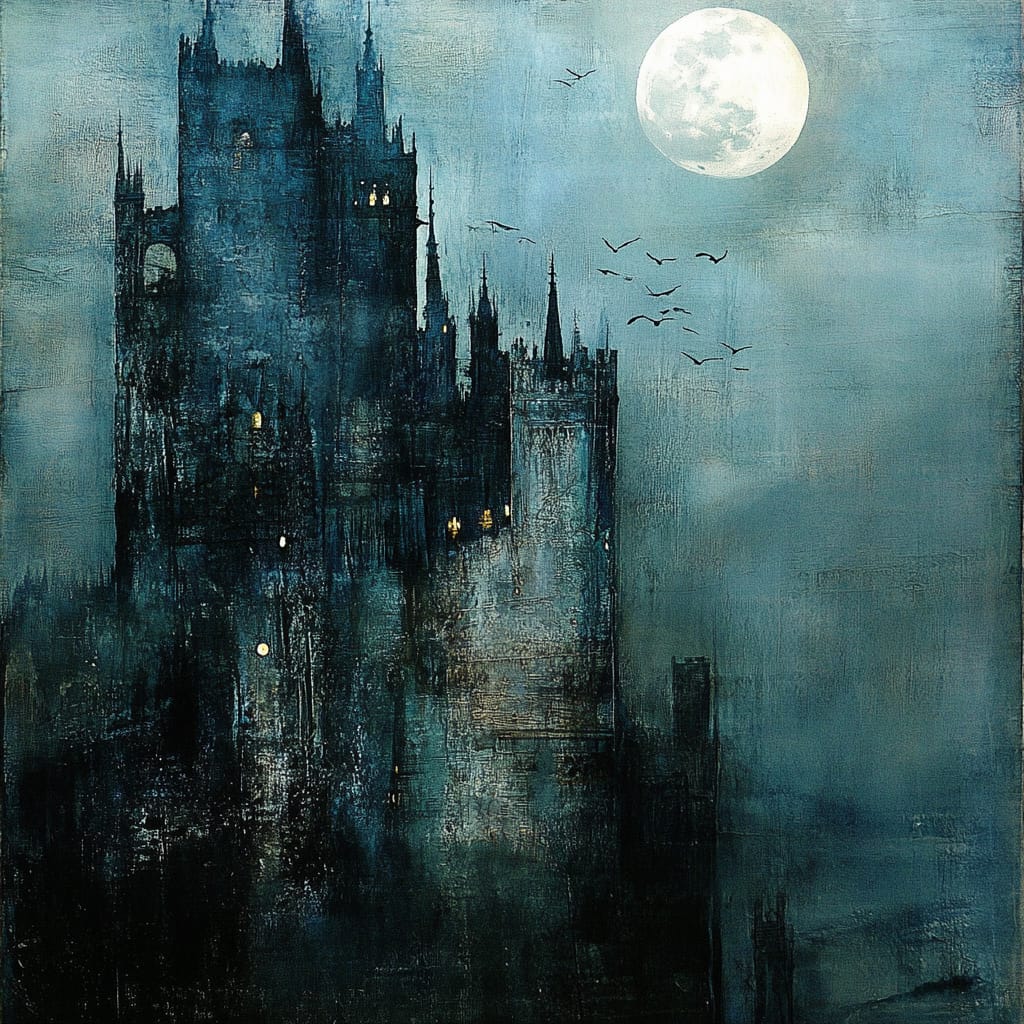 - A towering, decayed castle illuminated by a pale full moon; its cracked walls are intertwined with glowing vines, and faint silhouettes of birds circle in the misty night sky --sref 398643499 --stylize 200