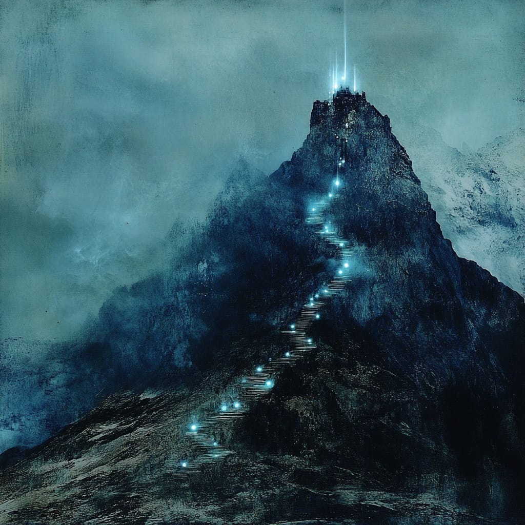 - A mountain peak with a glowing spiral staircase carved into its side; faint beams of light shoot into the sky from an unseen source at the summit --sref 398643499 --stylize 200