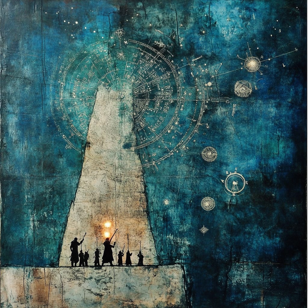 - An ancient celestial map etched into the surface of a massive glowing stone; surrounding it are explorers with their lanterns, deciphering the forgotten symbols --sref 398643499 --stylize 200