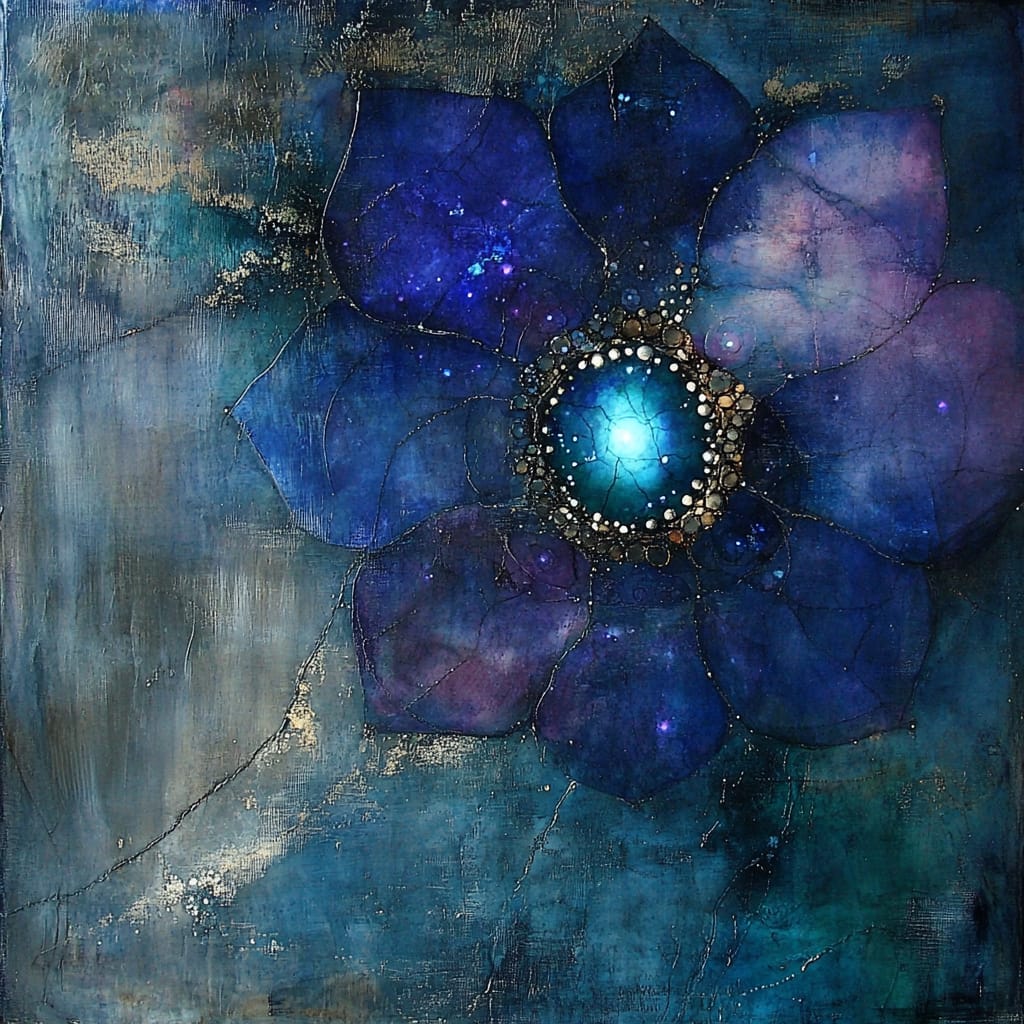 展现出浓厚的梦幻与超现实主义画风,结合浪漫主义的诗意表达和废墟美学的视觉冲击。色彩以冷色调为主,运用了丰富的蓝色与灰色层次,通过对比强烈的暖色点缀(如灯光和局部红色),构建了冷暖交织的情感氛围。技法上,以刮擦、叠加和自然流动的笔触塑造画面质感,营造出斑驳陈旧的表面效果,仿佛诉说着时间的侵蚀与岁月的痕迹。构图注重空间层次与叙事性,通过高低错落的建筑布局、背景中的远景朦胧处理以及透视关系的运用,拉开了视觉的纵深感。细节设计融入了拟人化和自然元素,例如、花卉装饰和月亮等,这些元素与建筑和场景交织,赋予作品神秘而奇幻的情绪。画风整体体现了一种隐喻性的叙事表达,描绘出人与自然、文明与废墟之间的微妙平衡,兼具荒凉与希望的情感张力。