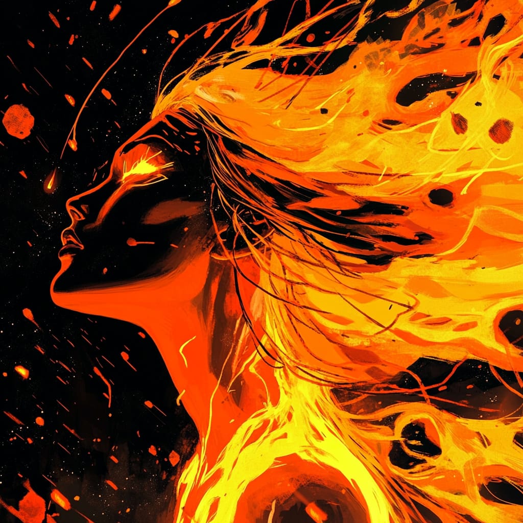 - goddess of fire, blazing hair flowing like lava, glowing skin, eyes radiating molten energy, surrounded by fiery embers, surreal lighting, abstract smoke trails, dynamic composition, cosmic backdrop, divine aura --sref 632584643 --v 6.1 --stylize 200