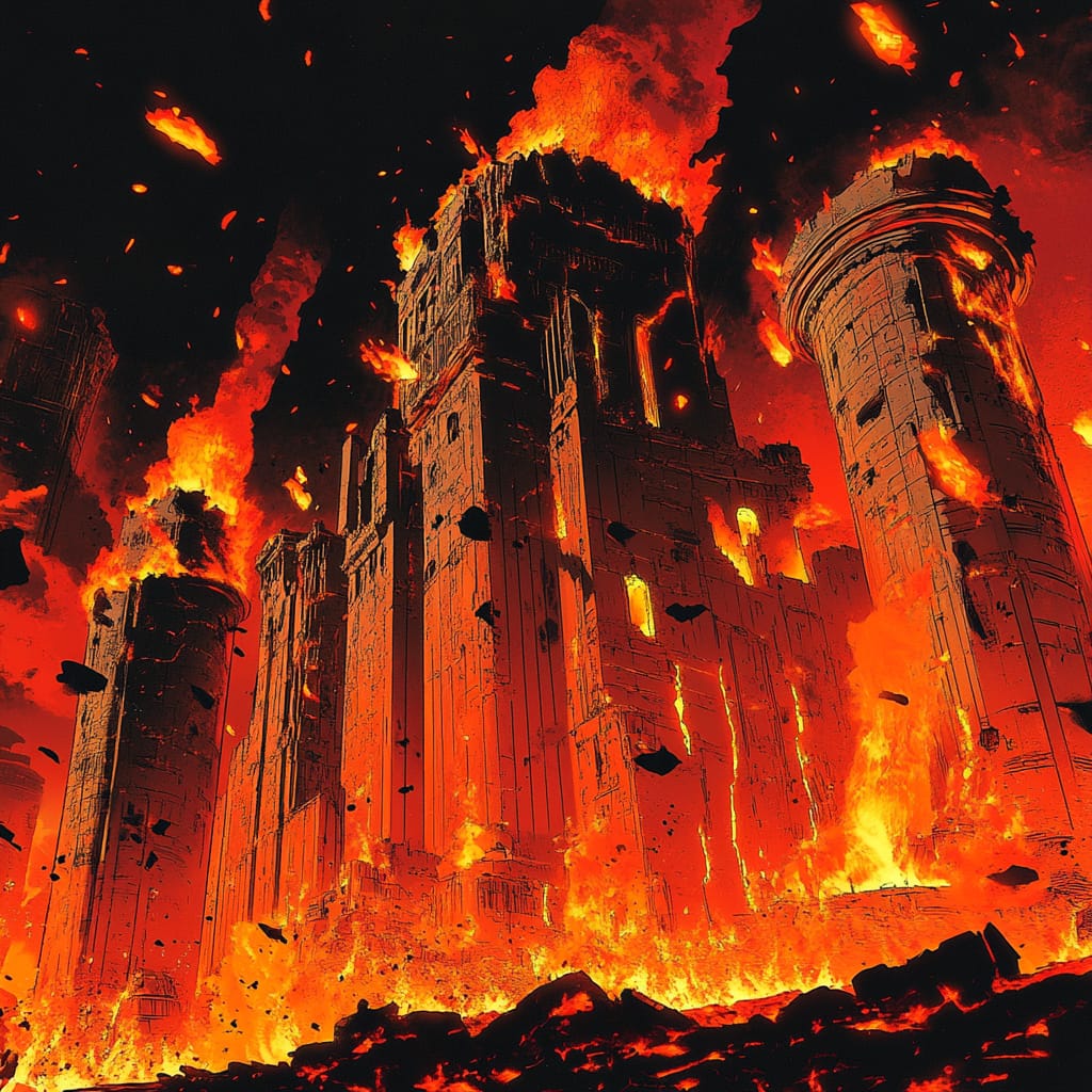 - colossal ruins engulfed in flames, molten details on ancient structures, glowing pillars, embers floating, dark apocalyptic setting, vibrant red and black tones, surreal and mysterious atmosphere --sref 632584643 --v 6.1 --stylize 200