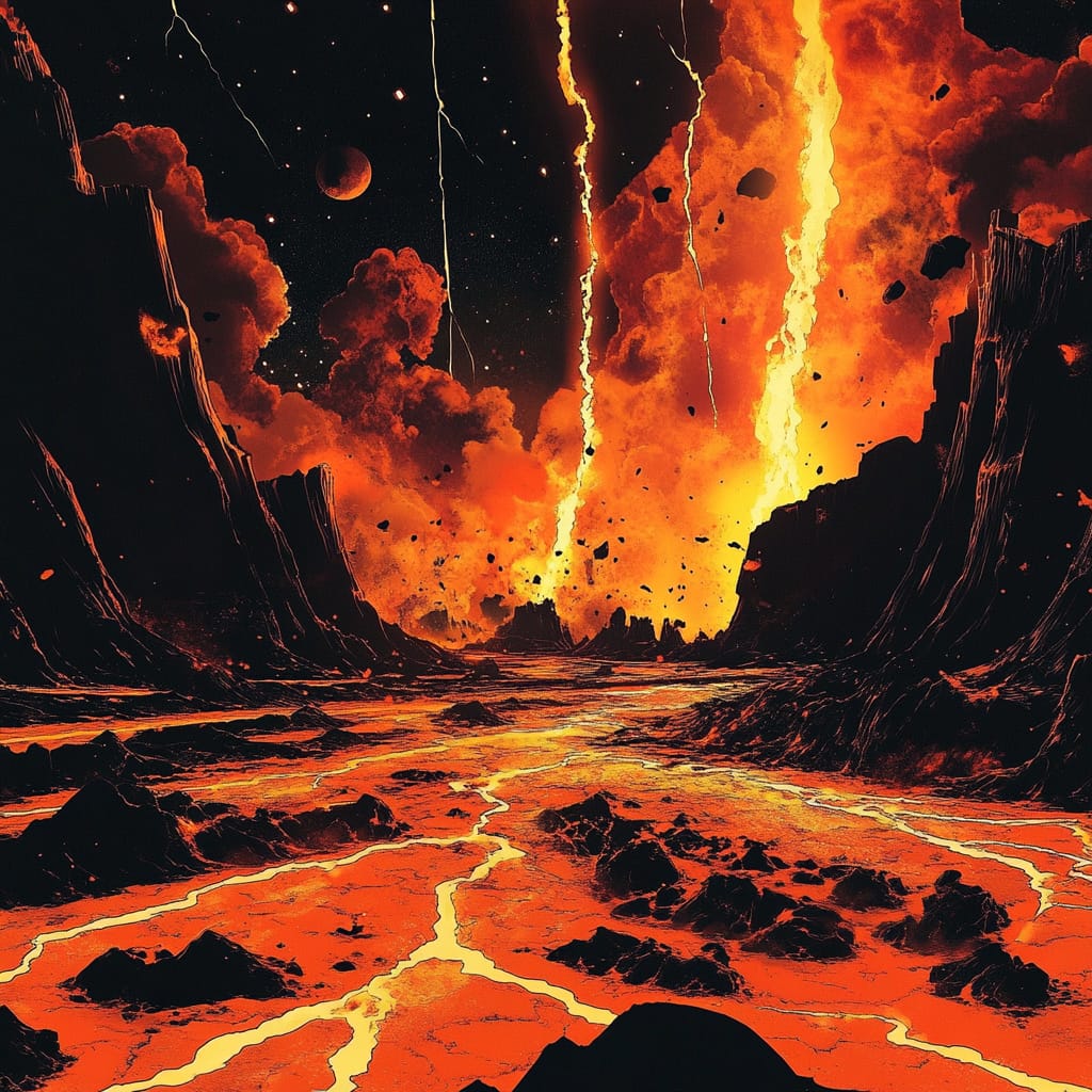 - alien planet with glowing lava cracks, fiery sky filled with burning meteors, surreal energy surging from the ground, vibrant orange and black tones, atmospheric lighting, dramatic scale, volcanic chaos, otherworldly landscape --sref 632584643 --v 6.1 --stylize 200