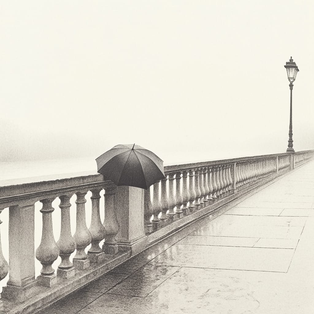- a single open umbrella lying on an empty stone bridge under overcast skies, soft grayscale texture with detailed railing and distant riverbank --sref 612966960 --stylize 200