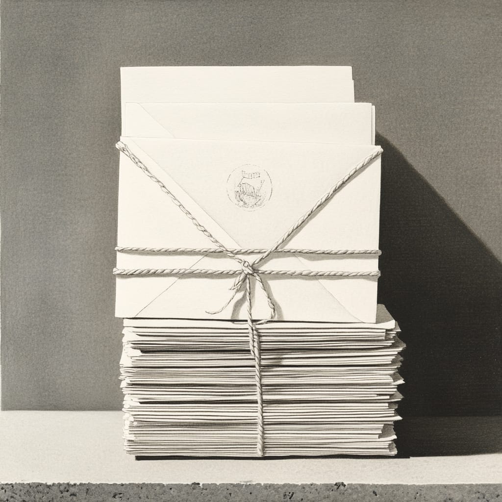 - a stack of unopened letters tied with string placed on a concrete step in morning light, minimal background with soft shadows and clean negative space --sref 612966960 --stylize 200
