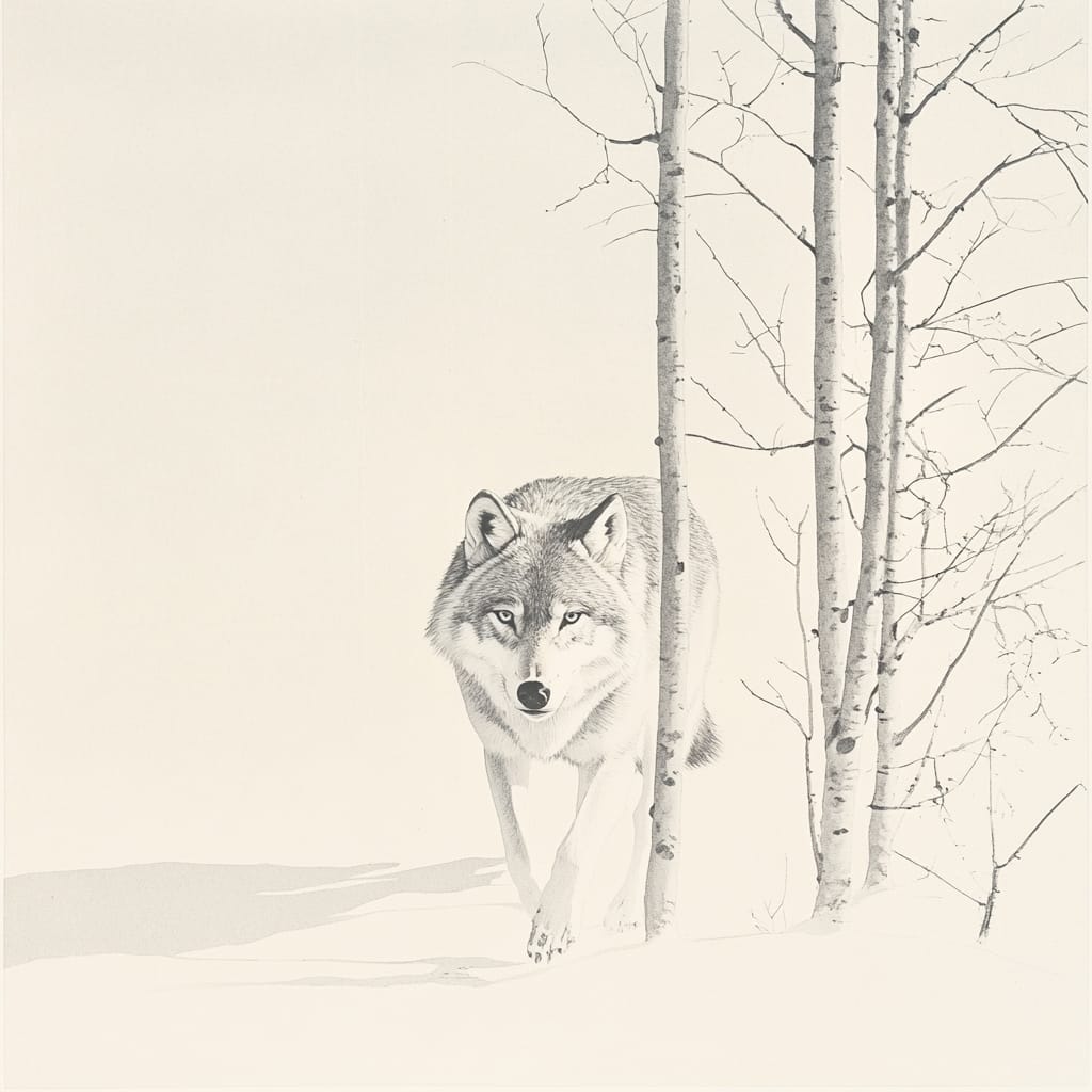 - Looking straight ahead, there is a wolf walking on the snow. --sref 612966960 --stylize 200