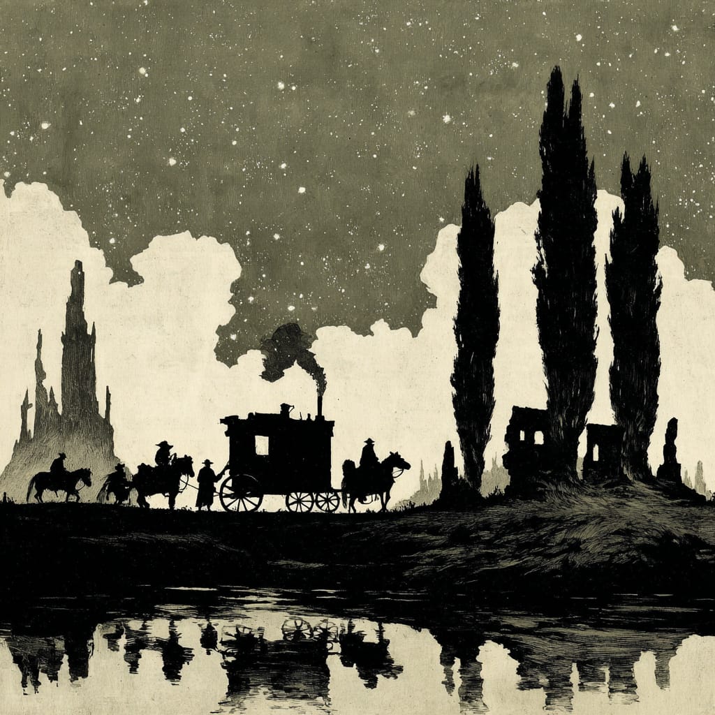 - a ghostly caravan crossing a desert of glass with skeletal trees ancient ruins and a pale green sky filled with static stars --sref 329619746 --v 7 --stylize 200 --sv 4