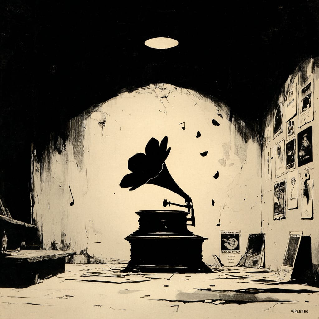 - a gramophone blooming into a dark flower in a room filled with floating music notes and torn posters on cracked plaster walls --sref 329619746 --v 7 --stylize 200