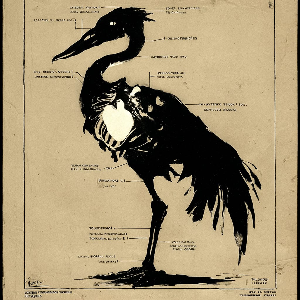 - a fictional anatomy chart of a mythical bird showing bones feathers and glowing organs labeled in an invented script --sref 329619746 --v 7 --stylize 200