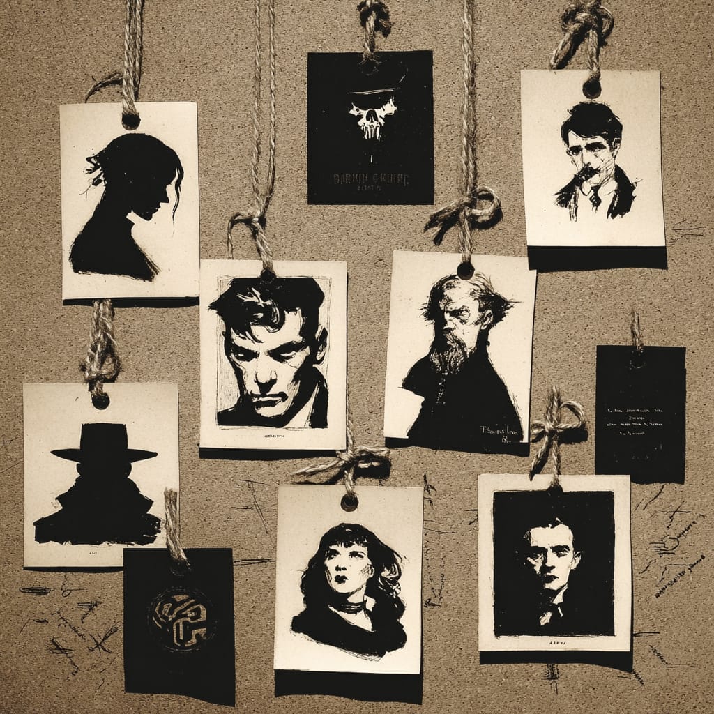 - a collection of mysterious portraits pinned to a corkboard with twine connections handwritten notes and cryptic symbols --sref 329619746 --v 7 --stylize 200 --sv 4
