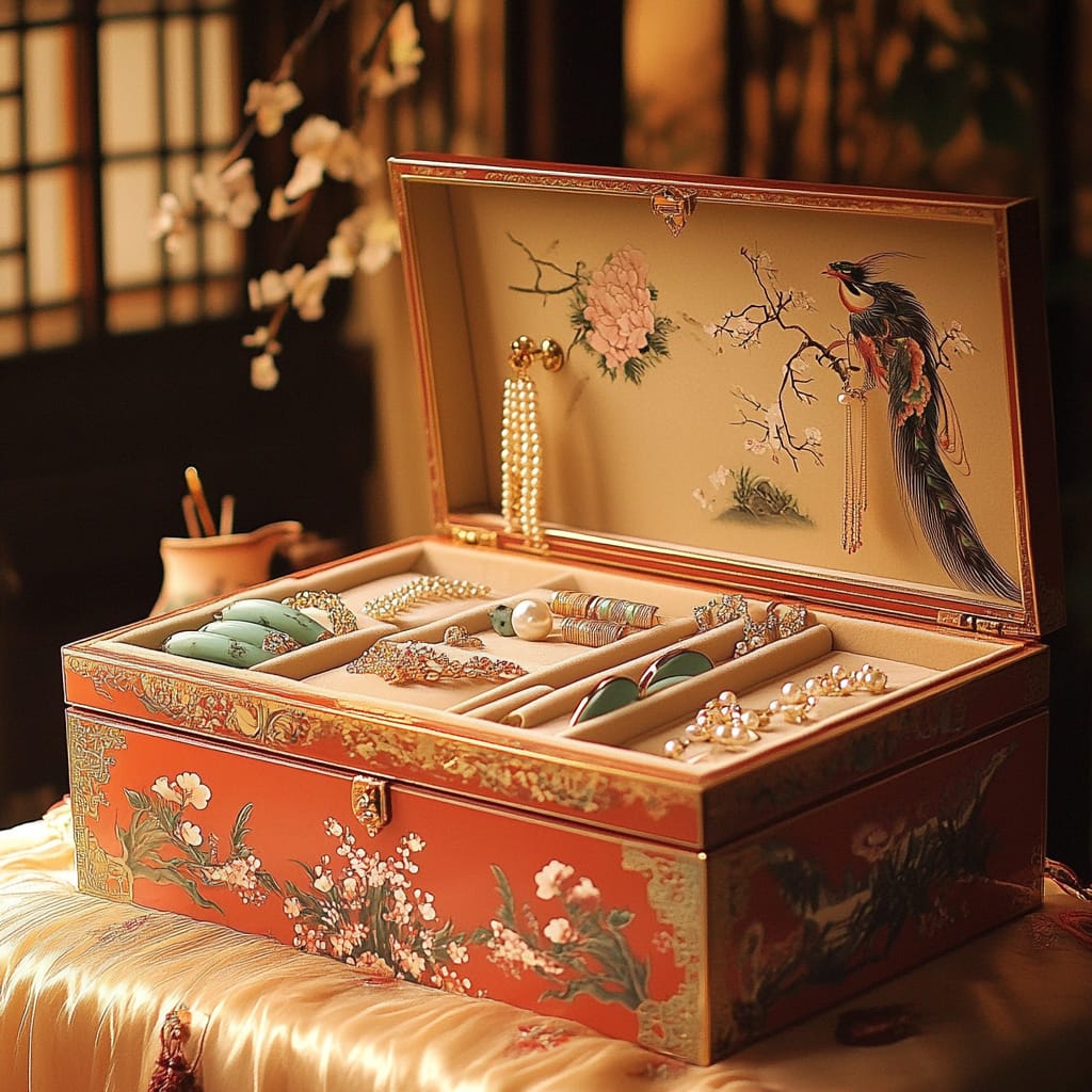 - A luxurious Chinese-style jewelry box, intricately carved with floral and phoenix motifs, lacquered in deep red with golden accents, the lid slightly open to reveal delicate jade bangles, pearl earrings, and a gold hairpin inlaid with gemstones, the silk-lined interior reflecting soft light, detailed textures of the wood grain, metal engravings, and shimmering jewels, creating an elegant and refined atmosphere, ultra-detailed close-up --sref 331989922 --v 6.1 --stylize 200
