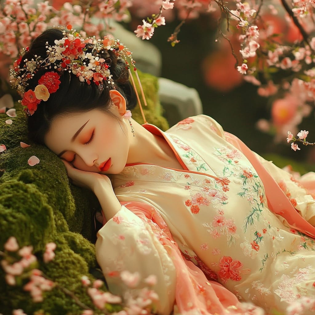 - A young Chinese woman in elegant traditional attire, lying with her head resting gently on her arm, surrounded by a profusion of vibrant blooming flowers, petals scattered across her silk sleeves and the mossy stone bench beneath her, soft moonlight illuminating her serene expression and the intricate embroidery on her clothing, dappled shadows from the dense blossoms adding depth, a dreamy and intimate atmosphere, ultra-detailed --sref 331989922 --v 6.1 --stylize 200