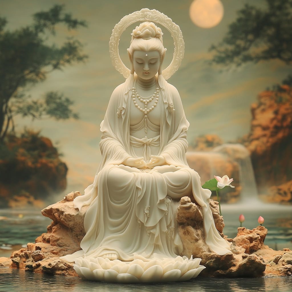 - A detailed and serene statue of the Water-Moon Guanyin (Shuiyue Guanyin), carved from smooth white jade, seated in a relaxed yet elegant posture on a rocky lotus base, her robes flowing with intricate folds, a calm and compassionate expression on her face, a delicate halo carved around her head, the statue surrounded by lotus blossoms and softly rippling water, moonlight casting a gentle glow, emphasizing the divine and tranquil atmosphere, ultra-detailed and mystical --sref 331989922 --v 6.1 --stylize 500