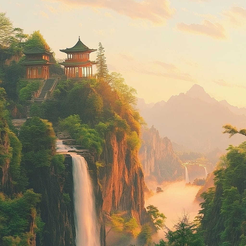 - A majestic Chinese mountain landscape, featuring towering mist-covered peaks, cascading waterfalls flowing into winding rivers, lush green bamboo forests and pine trees covering the slopes, traditional wooden pavilions perched on cliffs, stone pathways weaving through the terrain, soft golden sunlight breaking through the morning mist, distant mountains fading into the horizon, creating a serene, poetic, and immersive atmosphere, ultra-detailed and timeless --sref 331989922 --v 6.1 --stylize 200