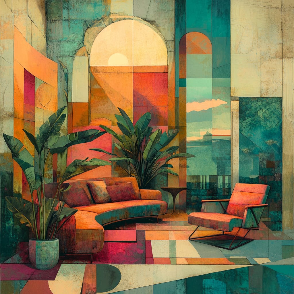 - A thoughtful blend of warm and cool tones--such as orange, teal, and muted pinks--creating a balance between vibrancy and subtlety, often evoking a vintage yet modern feel. --sref 997894486 --stylize 200