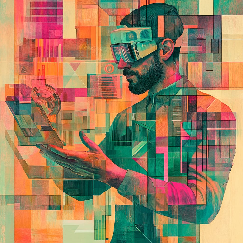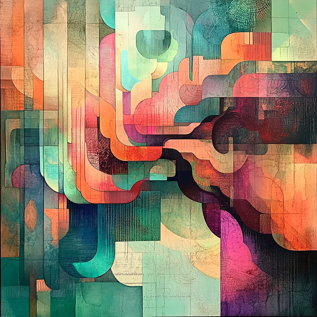 具有强烈的几何感和抽象表现力,利用丰富的色彩层次和透明度叠加效果,营造出充满空间感和梦幻氛围的画面。作品以几何形状为主要元素,通常采用暖色和冷色相结合的调色,如橙色、红色、蓝绿色等,使画面既温暖又冷静。几何形状的叠加营造出深邃的空间感,而建筑物或人物通过几何形式展现,既具识别度又充满抽象之美。细腻的纹理叠加增加了层次感和手工艺质感,即便使用多种颜色,整体调色仍然保持沉稳和谐,形成一种既现代又带有复古情调的效果。
