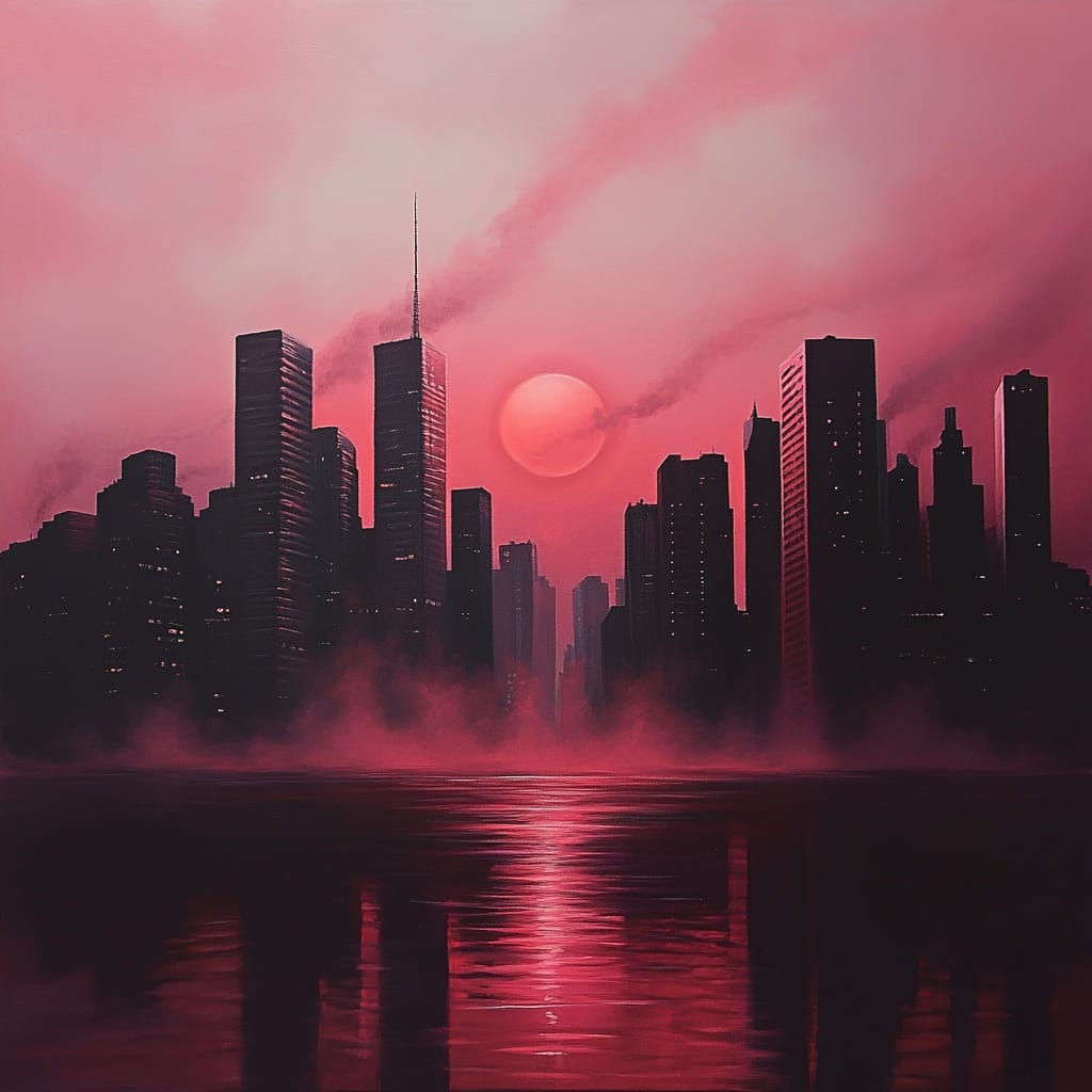 - A surreal cityscape submerged in translucent crimson waters, where glowing skyscrapers reflect on the liquid surface, ethereal mist spiraling upward, and an otherworldly red moon illuminating the horizon --sref 233109891 --stylize 200