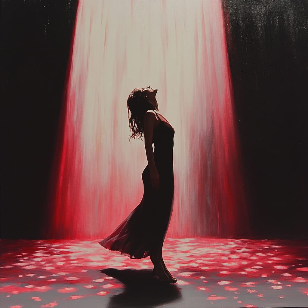 - An abstract theater stage illuminated by fragmented beams of red and white light, cascading shadows forming intricate patterns on the ground, and a solitary dancer frozen mid-pose, her silhouette encased in shimmering particles --sref 233109891 --stylize 200