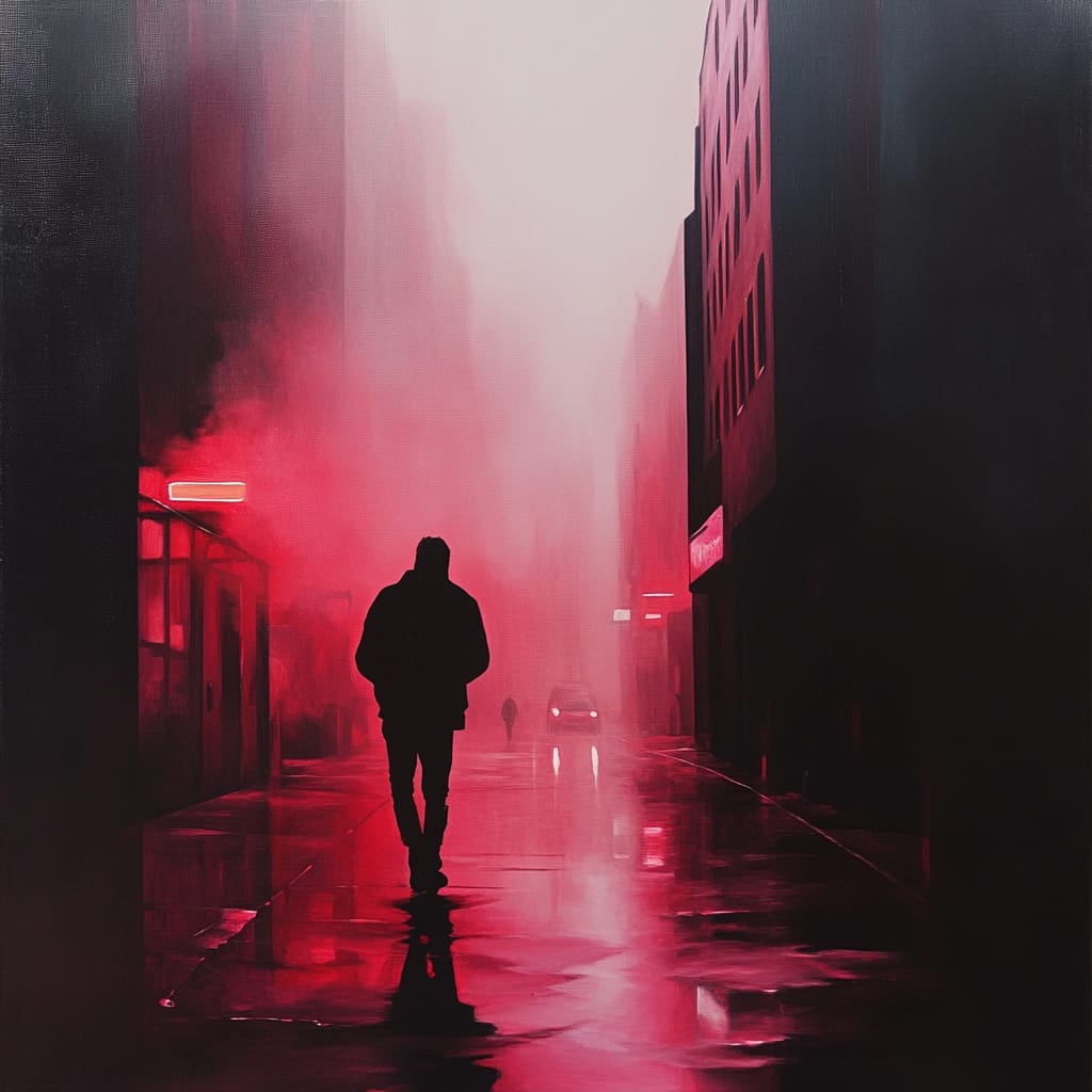 - A dystopian urban alley illuminated by vivid red neon lights, a lone silhouetted character standing amidst rising mist, wet reflective pavements adding a cyberpunk aesthetic, and towering dark buildings fading into the foggy horizon --sref 233109891 --stylize 200
