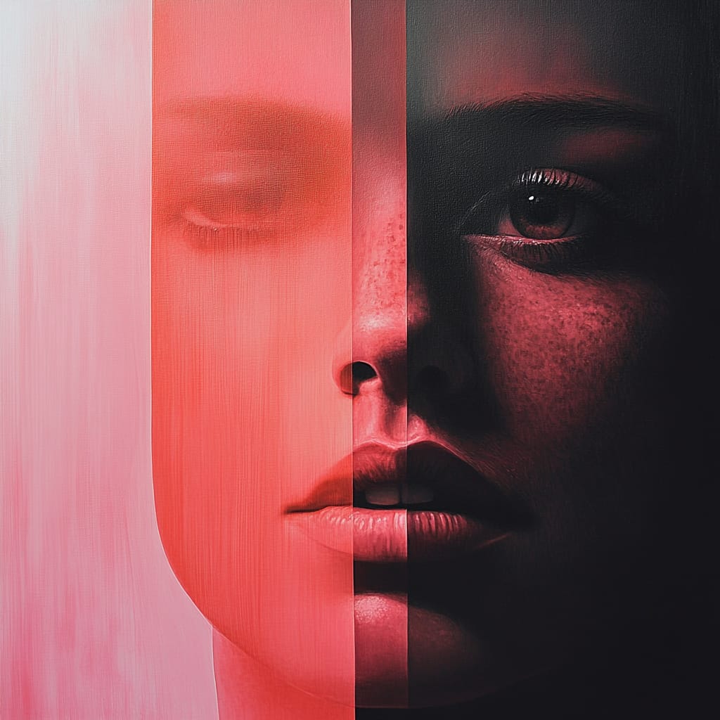 展现出一种鲜明的戏剧性与情感张力,结合了写实与氛围艺术的特点,通过光影、色彩和材质的巧妙处理,营造出梦幻与现实交织的独特视觉效果。整体色调以红色和粉色为主,搭配深黑与冷色光影的对比,形成强烈的视觉冲击和情绪表达,仿佛置身于迷离的梦境之中。光影处理尤为突出,利用柔和的渐变与光晕效果,增强了画面的深度与空间感;材质表现则结合光滑与粗糙对比,进一步提升了画面的触感层次。人物的描绘以特写为主,面部细节精致,情感刻画细腻,肢体语言充满张力,而场景布局则多以中心聚焦的构图形式呈现,辅以背景的雾化处理,突出主体的叙事性与情绪感染力。这种风格整体氛围浓郁、情感强烈,完美平衡了现实与超现实的艺术表达。