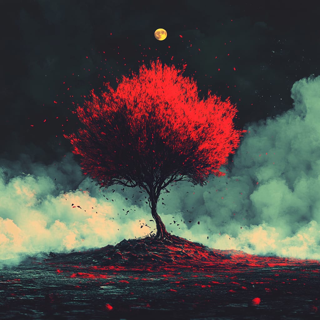 - A desolate landscape with a massive red tree blazing against a smoky sky, a distant mountain ridge shrouded in ash clouds, glowing embers floating in the air, the moon barely visible through the haze, emphasizing destruction and isolation --sref 896960609 --v 6.1 --stylize 200