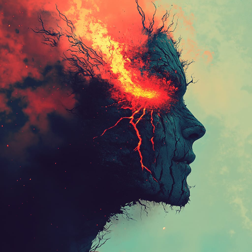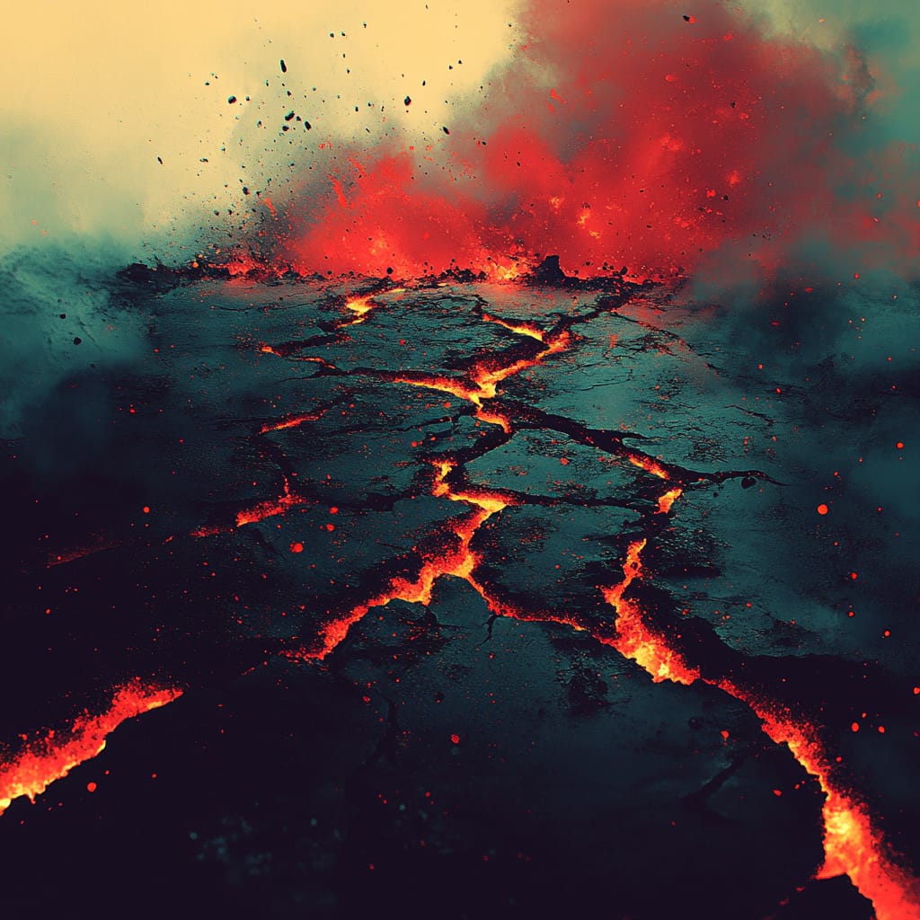 属于超现实幻想风格,以强烈的色彩对比和张力十足的构图为特点,呈现出视觉与情感的双重冲击力。画面通过浓烈的红色与冷色调(青色、绿色)的对比,突出火焰、熔岩和毁灭性景象的视觉效果,象征情感的爆发与生命力量的迸发,同时冷色背景营造出深邃与宁静的反差氛围。作品将抽象与具象相结合,既有燃烧的树、人脸与裂缝熔岩的清晰形态,又通过烟雾与流动的火焰融入模糊的抽象元素,赋予画面强烈的隐喻意义。意象多围绕毁灭与重生、生命的脆弱与顽强展开,动态与静态的背景相辅相成,既强调了力量的爆发,又隐含了沉思的深度。这种画风兼具情感张力与视觉冲击力,适合用于表达强烈情感、神秘力量或象征性主题的创作场景。。
