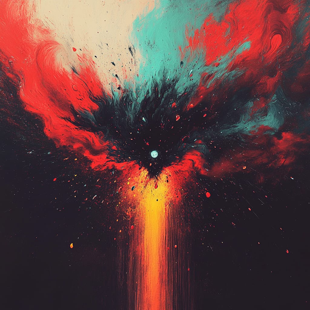 - An abstract explosion of colors blending red, black, and orange, a central figure dissolving into flames, symbolizing chaos and rebirth --sref 896960609 --v 6.1 --stylize 200