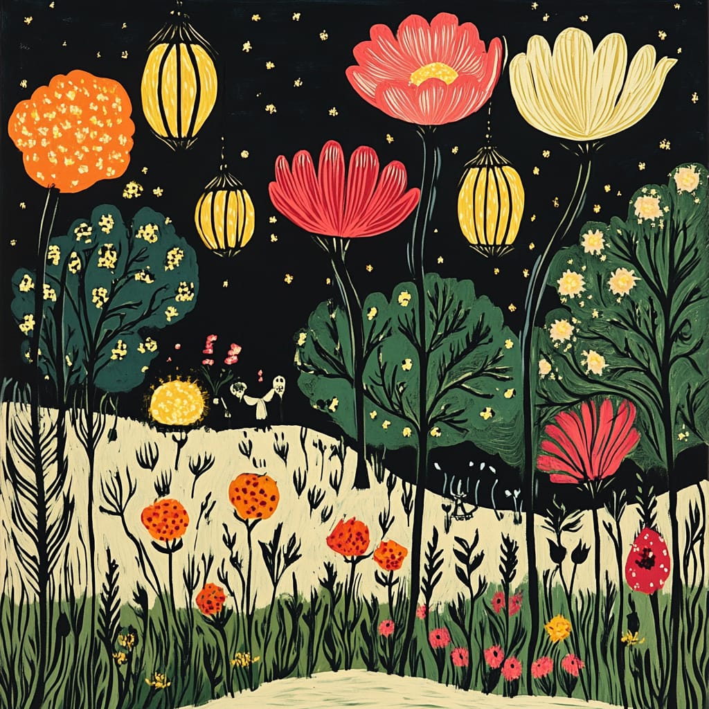- A vast meadow with oversized flowers glowing in vibrant colors under a moonlit sky. Lanterns hang from the branches of nearby trees, illuminating a small stage where forest creatures gather. The scene feels lively yet tranquil, with soft hues of green and gold --sref 994181816 --v 6.1 --stylize 200