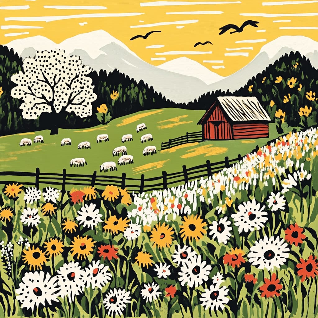 展现了一种现代民俗与童话式插画的独特风格,整体色调明快,使用了高饱和的红、黄、绿色作为主要点缀色,同时保留了复古插画风格的黑色线条勾勒。画风中大量运用了简化的自然元素,如花卉、树木以及乡村建筑,形成了生动的构图。画面的描绘既具有高度装饰性,又保留了稚拙的手绘质感,传递出一种质朴而梦幻的情感。平面化的构图和反透视处理加强了画面的装饰性,同时让人感受到一种直接且不受约束的叙事风格。这种画风灵感明显来源于民间艺术与自然主义插画,融合了传统的装饰性图案与现代的配色美学。