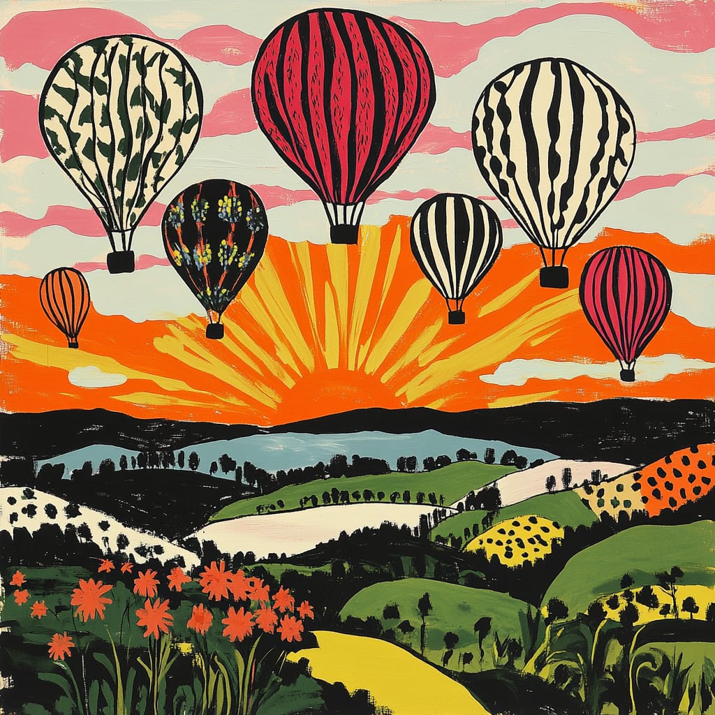 - A surreal scene of colorful hot air balloons floating over a dreamy, patchwork landscape of rolling hills and glowing lakes. The sky is painted in vibrant shades of orange, pink, and purple, with a rising sun casting long shadows over the terrain --sref 994181816 --v 6.1 --stylize 200
