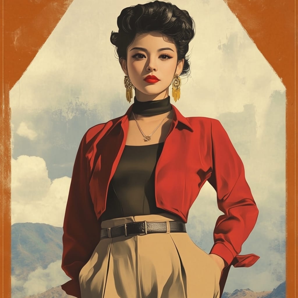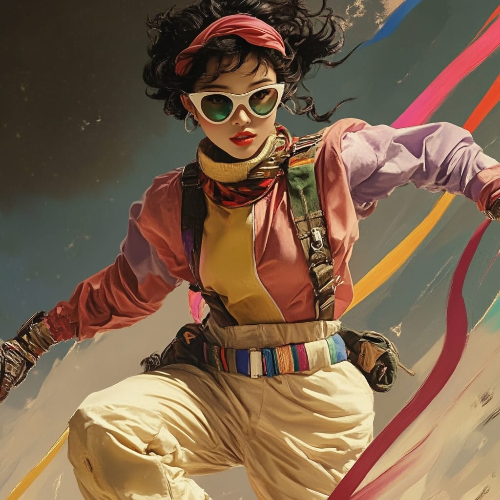 - A stylized character poses confidently in front of a flat, vivid background, designed for high visibility. The costume blends modern fashion with traditional motifs, and the color scheme is bold and complementary. Clean outlines, strong contrast, and a poster-like composition make it ideal for product branding. --sref 430405496 --v 6.1 --stylize 200