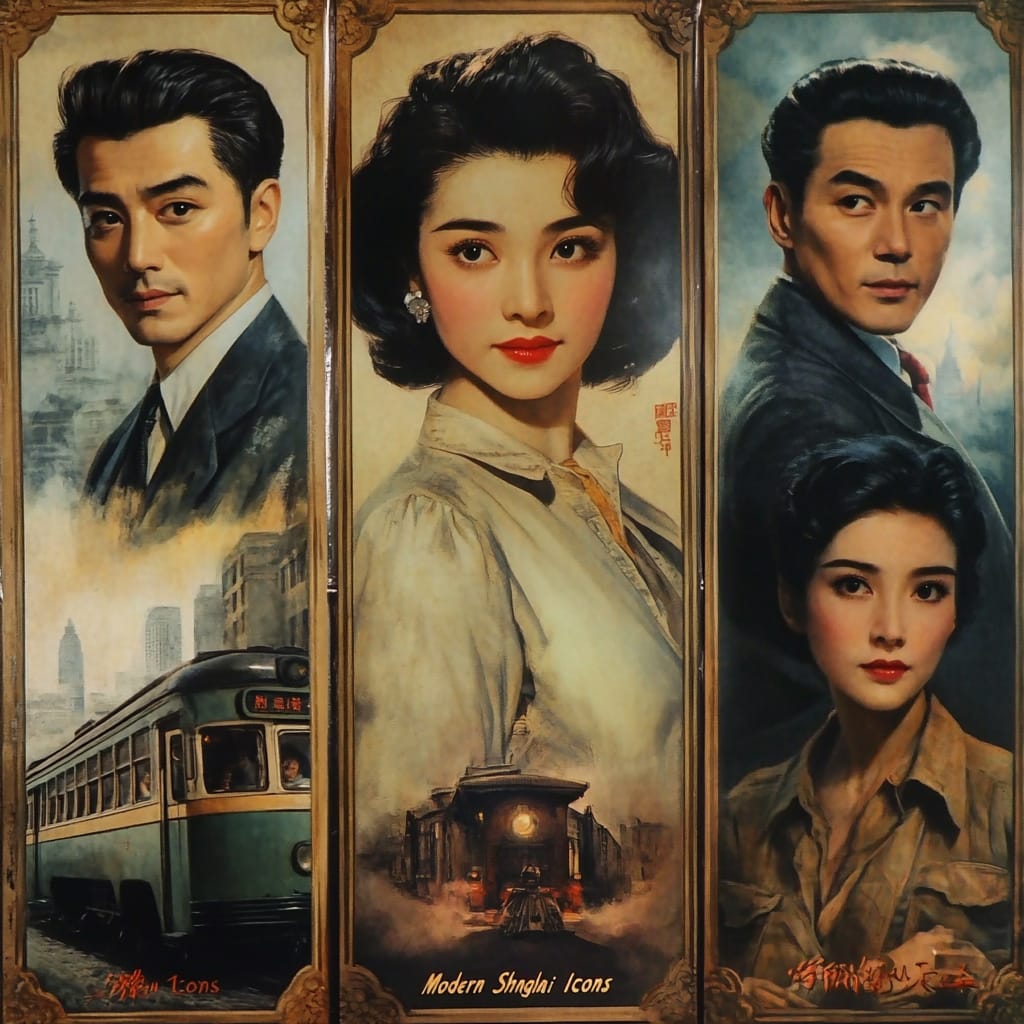 - A series portraits featuring "Modern Shanghai Icons" a singer, a tailor, a film actress, a tram driver each framed in deco-style borders with soft pastel backgrounds. --sref 430405496 --v 6.1 --stylize 200
