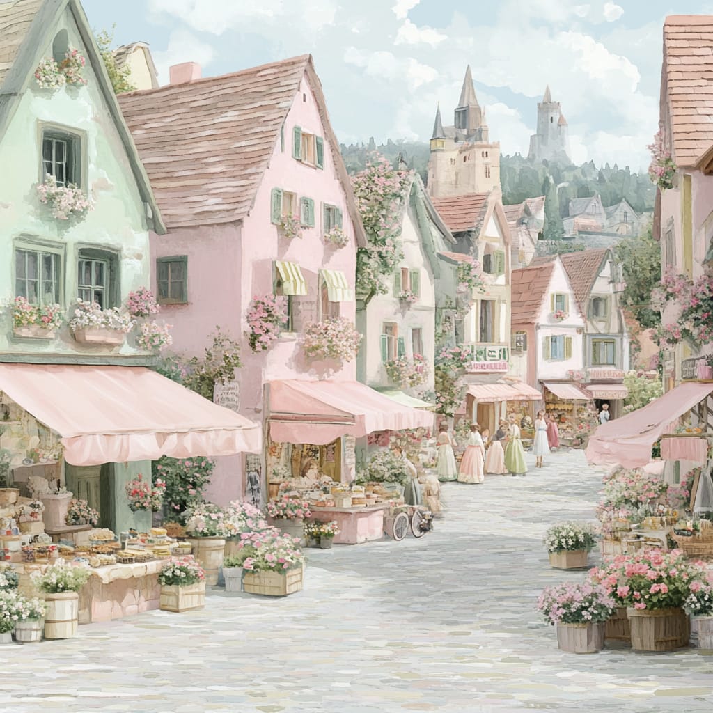 - A lively medieval town square with pastel pink and green buildings, charming market stalls adorned with flowers and handmade crafts, cobblestone streets bustling with people in vintage attire, golden sunlight creating a cheerful atmosphere --sref 528632133 --v 6.1 --stylize 200