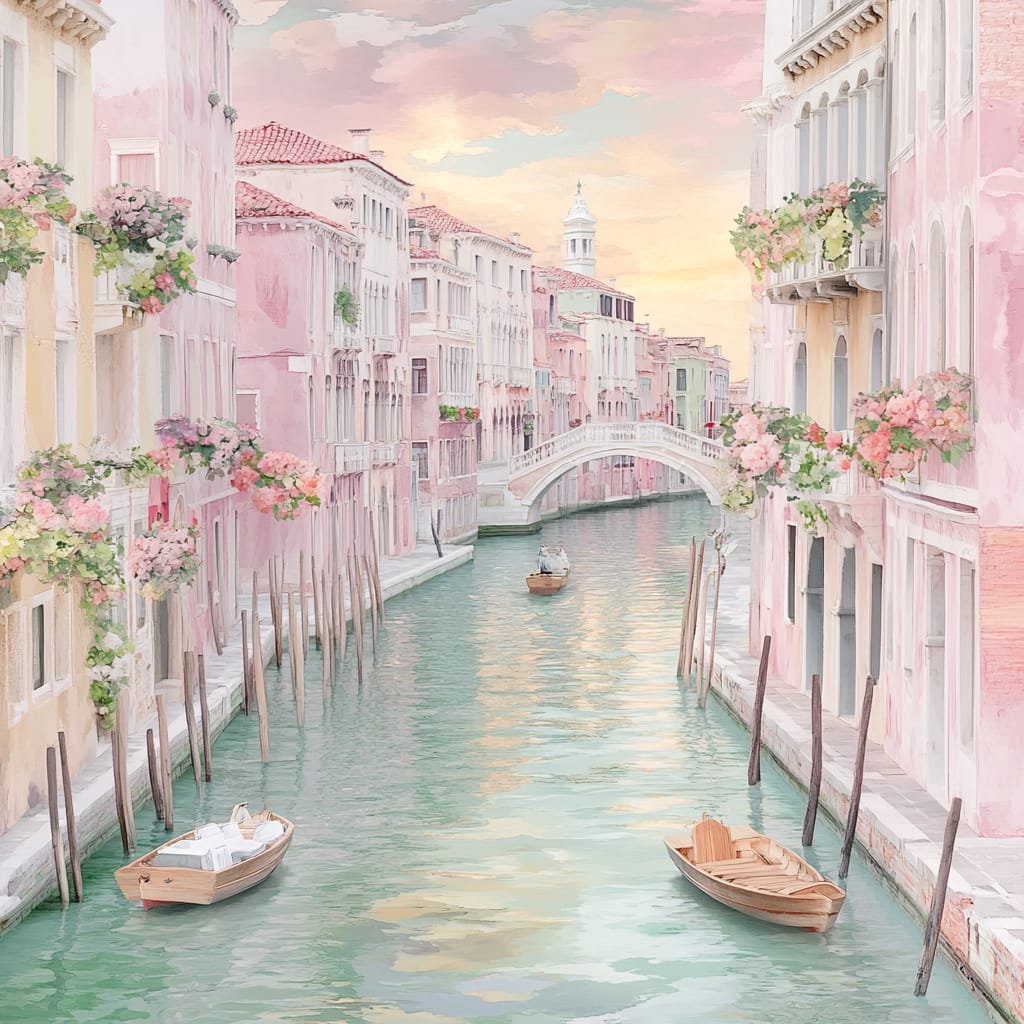 - A serene Venetian canal surrounded by pastel pink and yellow buildings with flower-covered balconies, small wooden boats floating on emerald-green water, a stone arch bridge in the distance, and a warm golden sunset sky --sref 528632133 --v 6.1 --stylize 200