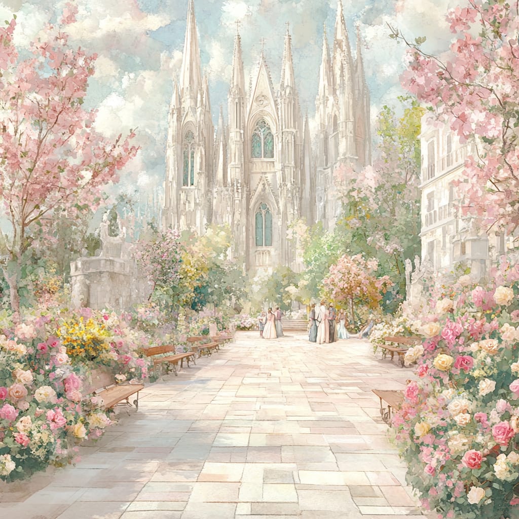 - A majestic Gothic cathedral with towering spires and intricate stained glass windows, sunlight casting vibrant colors on the stone plaza below, surrounded by blooming flowers and people relaxing on wooden benches, a serene and timeless atmosphere --sref 528632133 --v 6.1 --stylize 200
