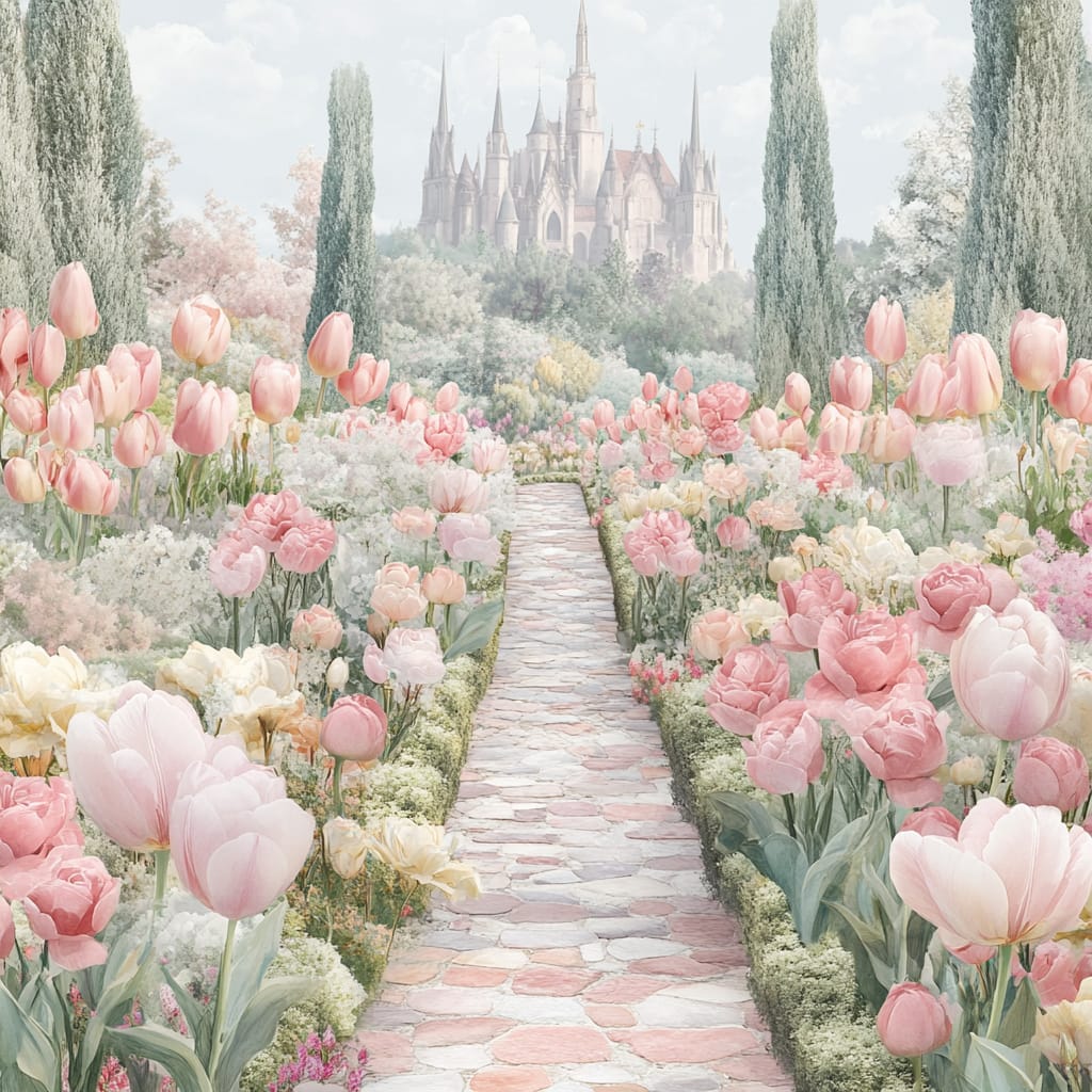 - A magnificent European castle garden with neatly trimmed hedges and cobblestone pathways, vibrant rose and tulip flowerbeds, Gothic spires of the castle rising in the background, and soft sunlight creating a fairytale-like ambiance --sref 528632133 --v 6.1 --stylize 200