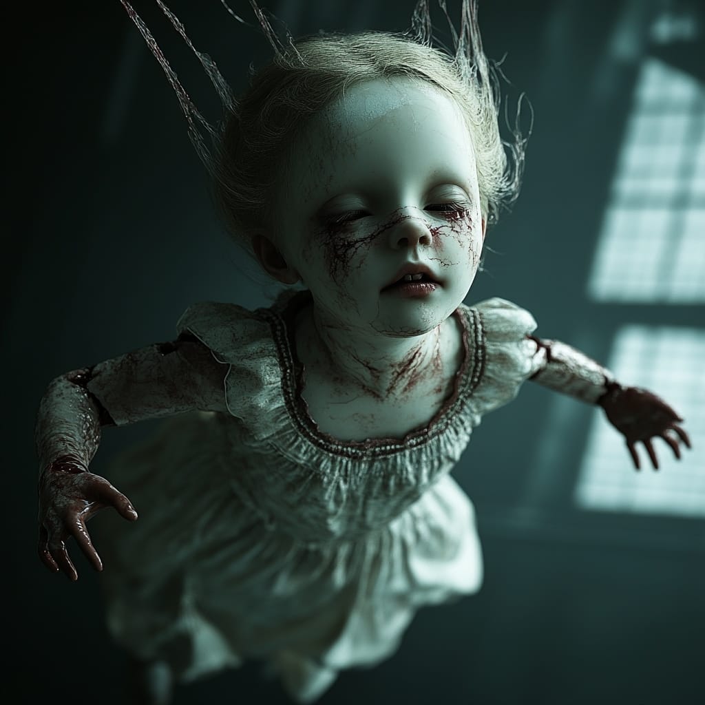 - lifeless porcelain doll suspended in mid-air, limbs detached and floating in perfect symmetry, expressionless cracked face, soft ambient light, pale background, unsettling calmness --sref 290058907 --v 6.1 --stylize 200