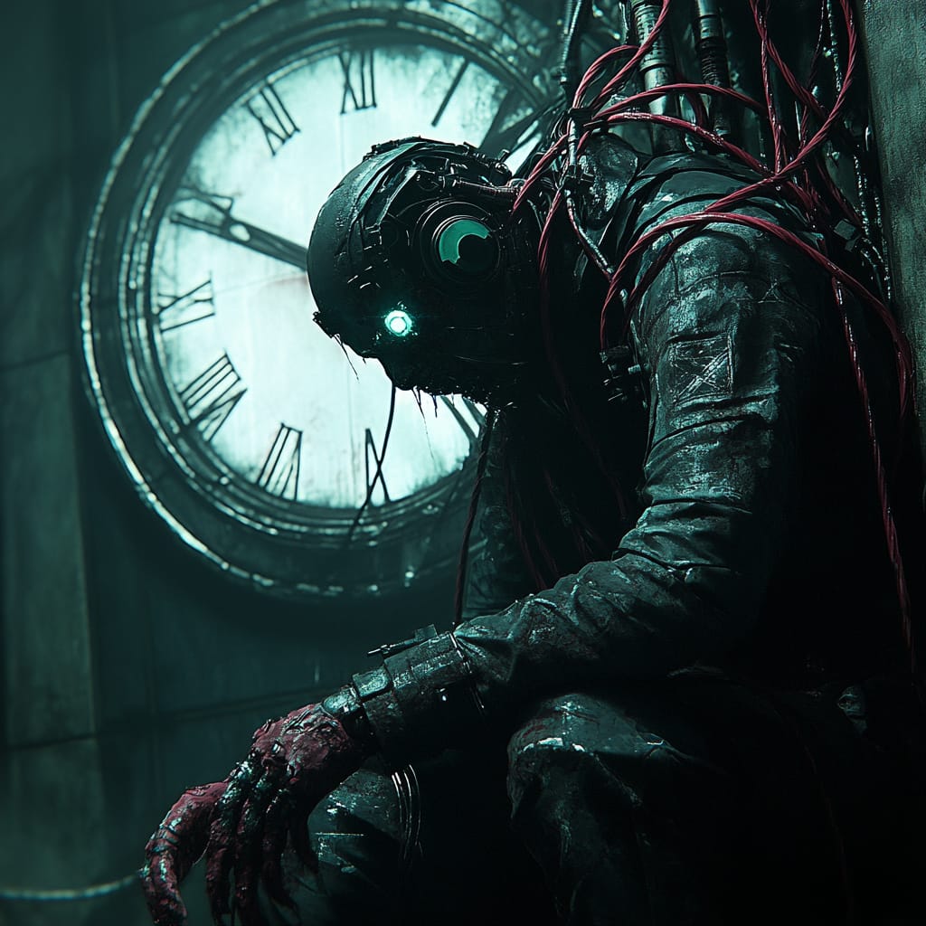 这些画面整体呈现出一种高度统一的赛博哥特(Cyber-Gothic)风格,其核心特征是融合了未来机械感与黑暗美学,创造出一种末世感极强、富有视觉冲击力的审美体验。画面普遍采用冷色调为主基调,尤其是青绿色调,营造出冰冷、压抑和神秘的氛围,同时通过红色的光源或血迹形成强烈的视觉对比,强化了暴力与脆弱并存的情绪张力。角色造型普遍具有机械与生物的混合特征,如义眼、金属植入物、有机形态的机械发丝与触角,暗示出人类与机器界限的模糊和异化。人物表情多半冷峻、空洞或带有悲剧性,进一步加深反乌托邦的叙事氛围。背景环境则呈现出工业化、废墟化的都市景象,光源多来自荧光灯或电子装置,强化了科技感与疏离感的结合。整体而言,这组图像通过细腻的纹理质感、精致的光影处理和一致的视觉语言,构建出一个既美艳又病态、既未来又古老的赛博炼狱世界。