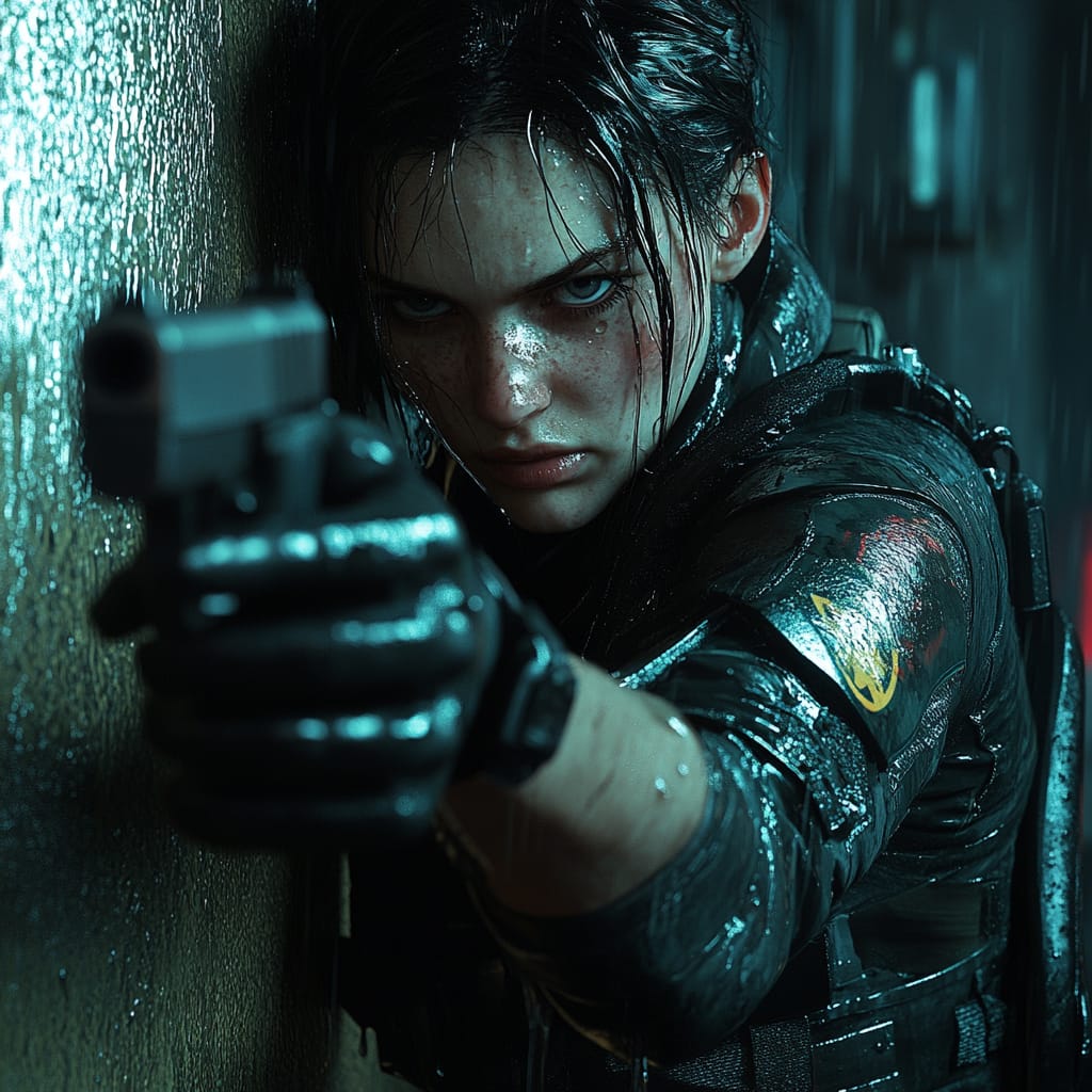 - female officer in tactical gear pressed against wall, aiming handgun in rain, water running down face, close-up on determined eyes, wet textures on clothing, dim alley lighting --sref 290058907 --stylize 200