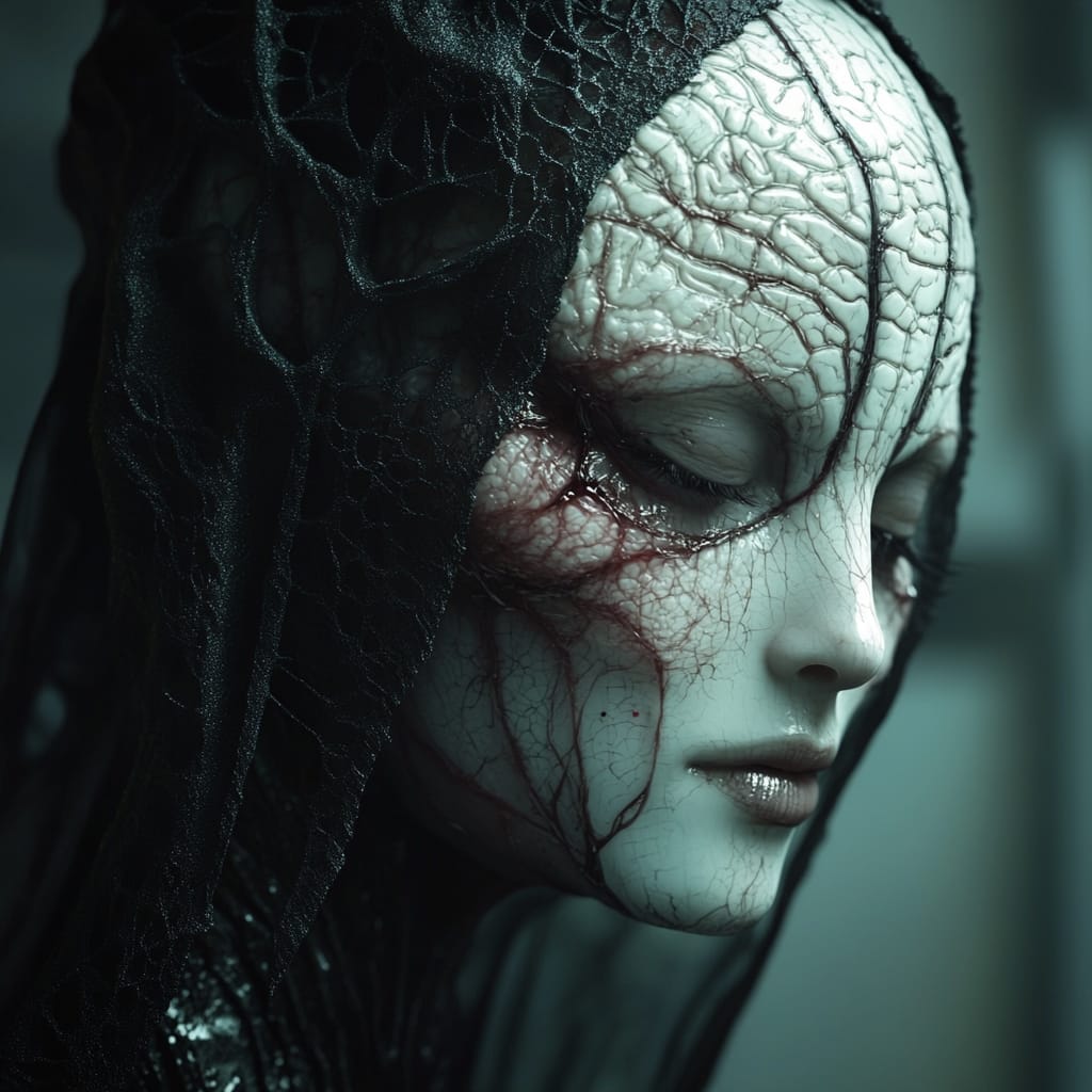 - human figure with delicate brain tissue draped over face like a veil, folds and gyri forming intricate lace patterns, serene expression behind the organic mask --sref 290058907 --v 6.1 --stylize 200