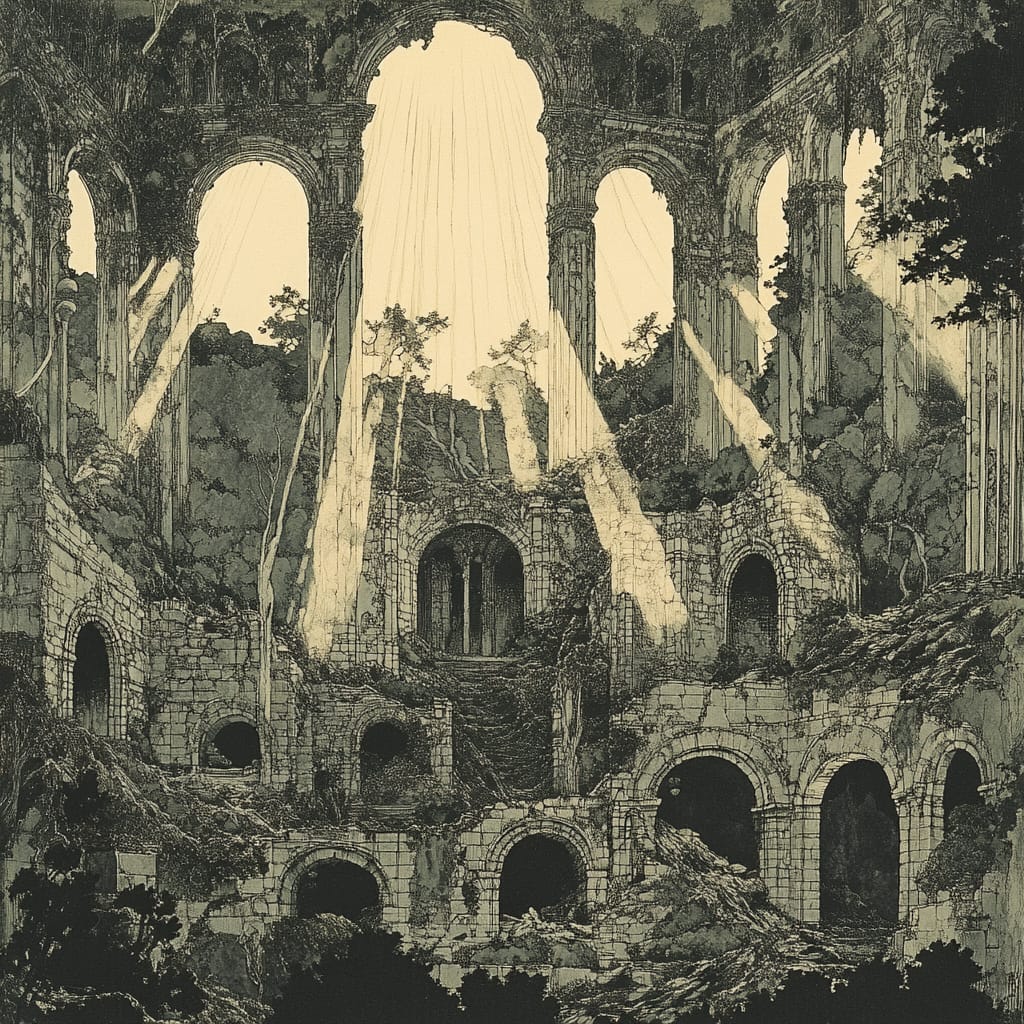 - A sprawling ancient ruin surrounded by lush overgrown vegetation, intricate stone carvings and worn-out archways illuminated by shafts of golden sunlight breaking through the misty forest canopy, fine ink-like lines sketching out the textures of aged stone and moss, evoking a mysterious and timeless atmosphere --sref 430881360 --v 6.1 --stylize 200