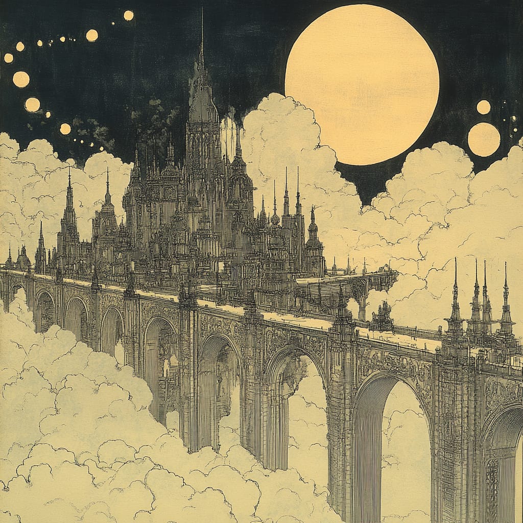 以黑白线条为主,融合复古与奇幻元素,表现出独特的审美张力。每幅画作通过细致的线条构建出繁复而深邃的画面,具有明显的装饰艺术风格。粗细对比鲜明的笔触在虚实之间游走,创造了浓郁的戏剧感和故事氛围。背景常采用泛黄纸张质感,与黑色线条形成强烈对比,增强了画面的历史感与沉浸感。画面中的构图极具层次,细节丰富而不凌乱。建筑与场景设计大胆而富有幻想,运用大量的圆形、曲线和几何形状,暗示着一种超现实的神秘力量。人物形象则通过精细的线条与背景相辅相成,表现出孤独、探索或与宏大环境对比的主题。整体色调较为克制,专注于黑白与浅黄色的对比,但细腻的纹理和结构使画面不失丰富性。点缀的星空、月亮等意象赋予画作浪漫的幻想气质,而建筑、自然元素则表现出一种史诗般的宏大叙事感。
