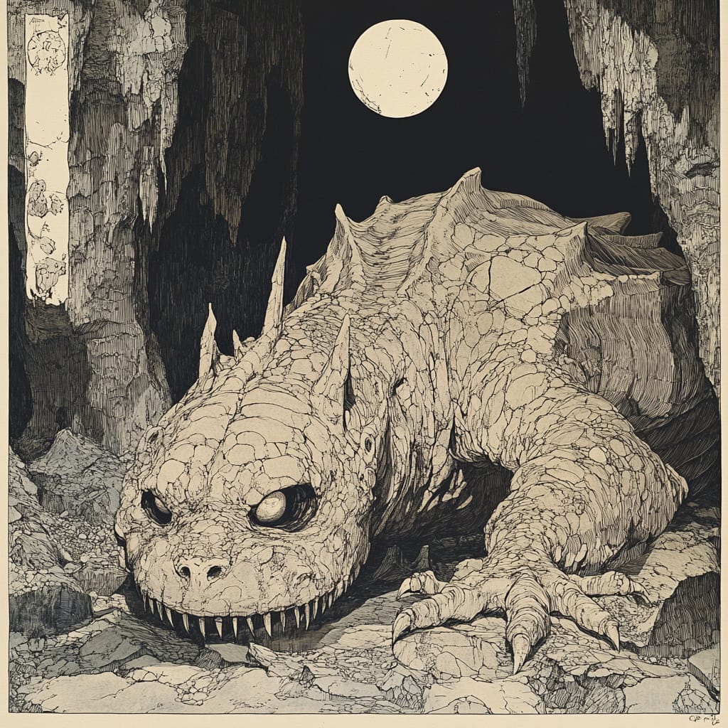 - A colossal beast lying dormant within a crumbling cave, its body entwined with moss and ancient stone, faint light seeping through cracks in the cavern walls, detailed linework emphasizing the creature’s immense scale and the rugged beauty of its surroundings --sref 430881360 --v 6.1 --stylize 200