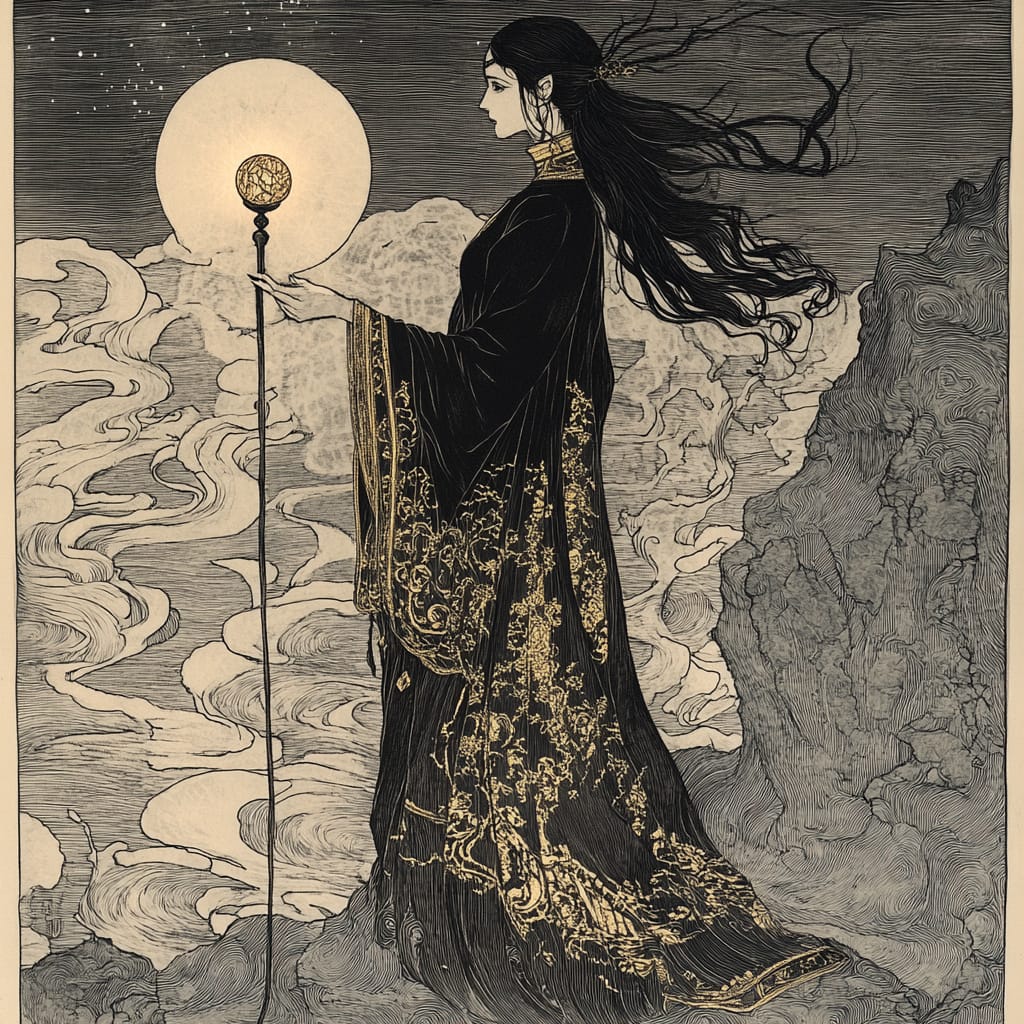 - A mysterious sorceress with flowing dark robes and intricate gold embroidery, holding a glowing orb in one hand and a staff carved with runic symbols in the other, standing on a cliff overlooking a moonlit sea, with a backdrop of swirling dark clouds and starlight, rendered in fine etched details --sref 430881360 --v 6.1 --stylize 200