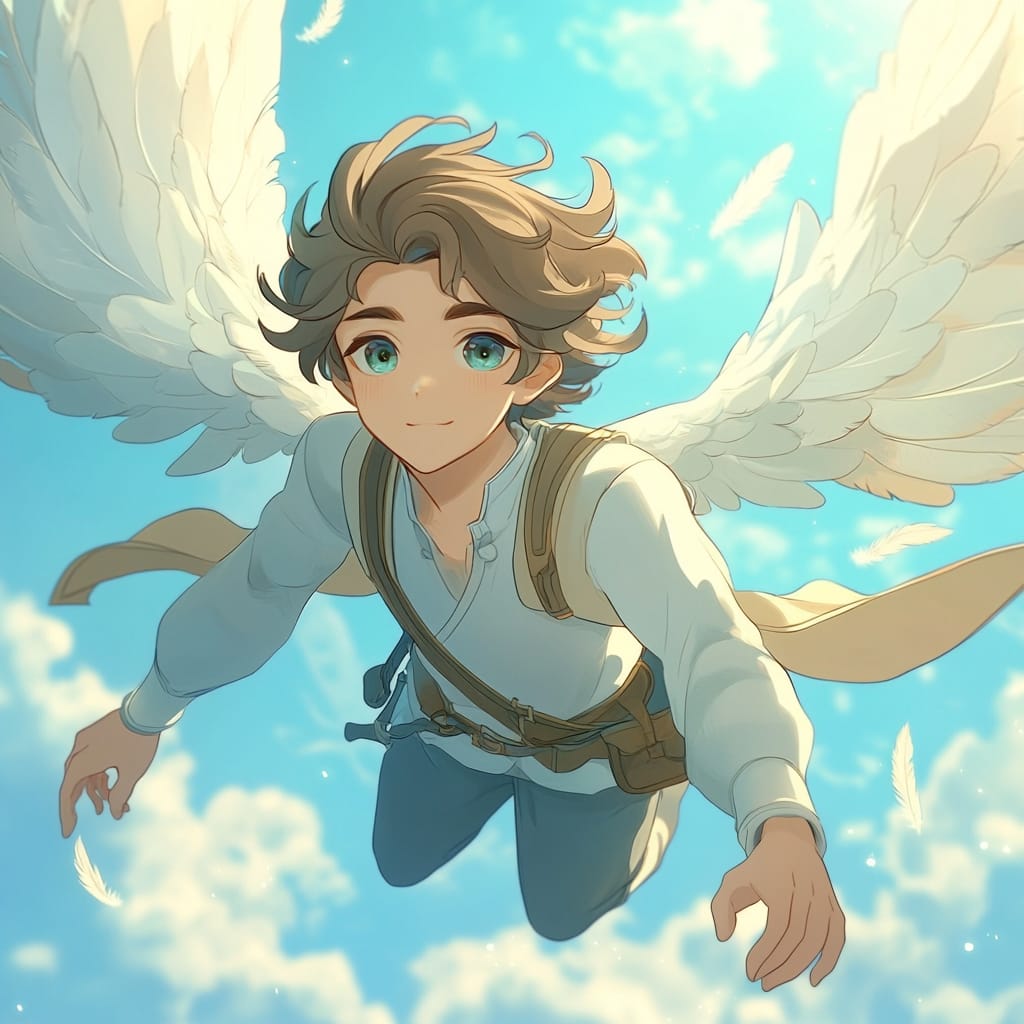 - A handsome teenage boy with youthful, delicate features flying effortlessly through the sky, his back adorned with elegant, feathered wings that shimmer in the sunlight. His short, slightly tousled hair dances in the wind, and his bright eyes reflect curiosity and wonder. He wears a light, flowing outfit with subtle, intricate patterns, designed for freedom and grace in flight. The expansive sky behind him is painted with soft hues of blue and white, dotted with fluffy clouds, adding to the serene and uplifting atmosphere of his soaring figure --sref 702441575 --v 6.1 --stylize 200