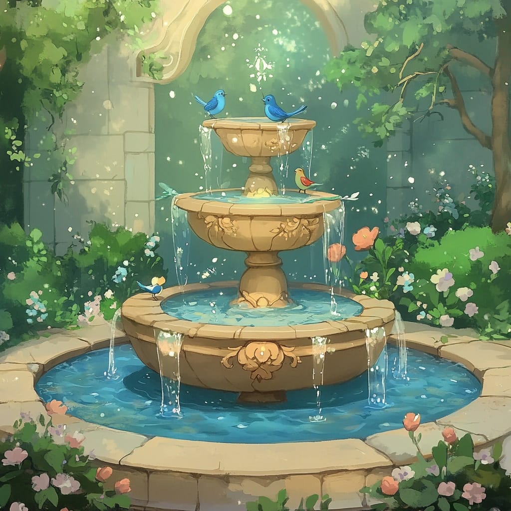 - a sparkling fountain surrounded by ornate tiles, with delicate floral patterns reflecting the light. Tiny droplets of water catch the sunlight, forming miniature rainbows, and small birds perch on the fountain's edge, creating a joyful and serene motif for a decorative piece --sref 702441575 --v 6.1 --stylize 200