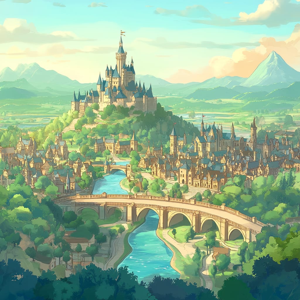 - A sprawling kingdom seen from atop a mountain ridge, with a majestic castle rising from the center of a bustling medieval city surrounded by forest. Rivers and bridges crisscross the landscape, and the sky is painted with warm sunset hues, evoking a sense of adventure and grandeur --sref 702441575 --v 6.1 --stylize 200
