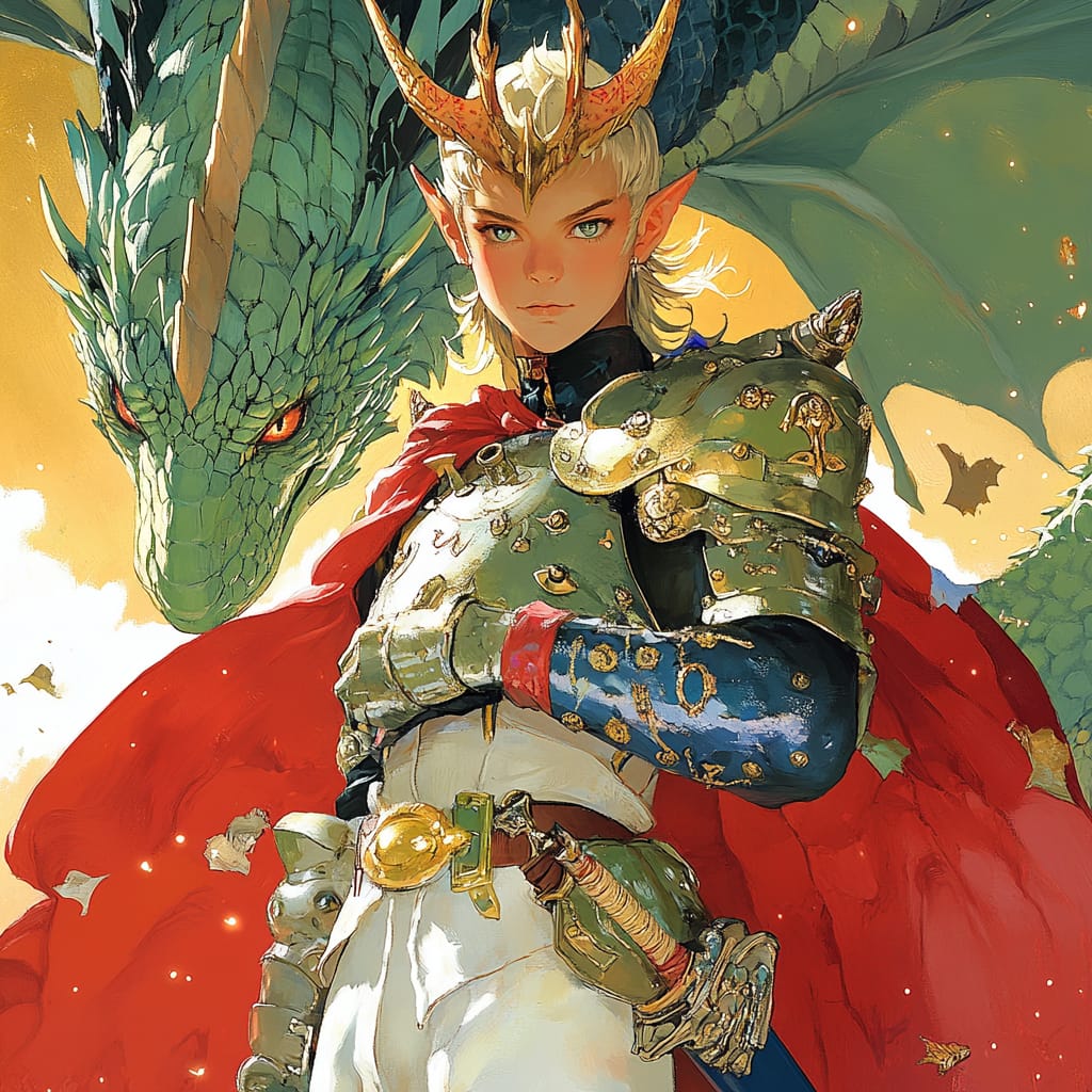 - A heroic dragon rider depicted from the front, their determined expression illuminated by the soft glow of magical runes etched into their intricately designed armor. They wear a billowing cape that flows behind them, and their piercing eyes convey bravery and strength. Their hand grips a glowing sword resting at their side, while faint light reflects off their armor. Behind them, the dragon's massive wings and part of its body are visible in a supporting, majestic pose, but the focus remains on the rider's face, framed by a dramatic golden sky filled with streaks of light --sref 595165858 --v 6.1 --stylize 200